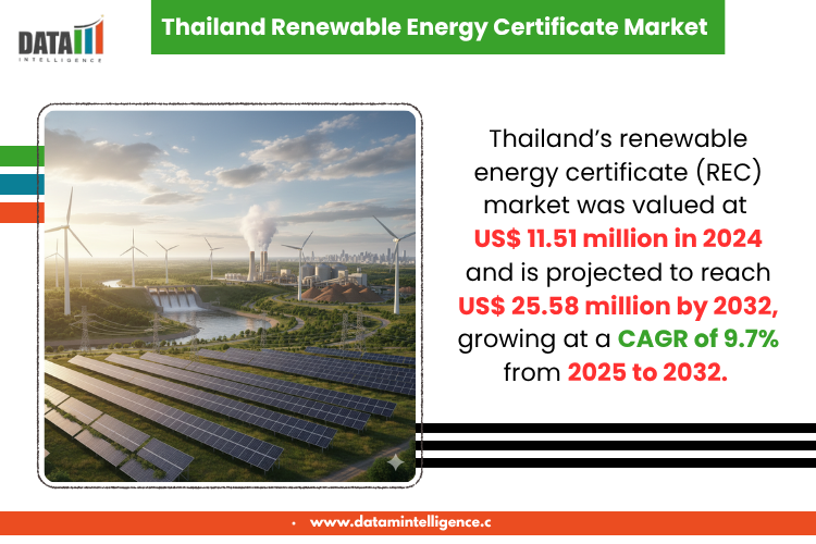 AUSTIN, TX, UNITED STATES, October 10, 2025 /EINPresswire.com/ -- Thailand's renewable energy certificate (REC) market is a rapidly expanding sector within the Asia-Pacific region, fueled by increasing environmental awareness and robust government policies aimed at sustainable energy adoption. Valued at US$ 11.51 million in 2024 according to DataM Intelligence, this market is projected to nearly double to US$ 25.58 million by 2032, growing at a compound annual growth rate (CAGR) of 9.7% from 2025 to 2032. This trajectory reflects Thailand’s firm strategic commitment to clean energy, underscored by its Power Development Plan (PDP 2024) which targets a significant milestone of 51% renewable electricity generation capacity by 2037.